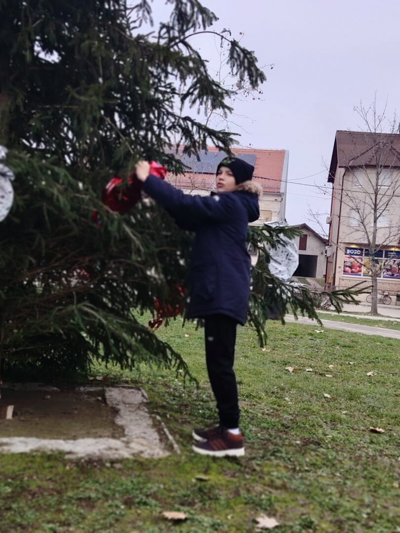 U utorak 23.12.2025. godine učenici 5.a razreda i učiteljica likovne kulture Marija Mendeš Marijanović ukrasili su božićnu jelku u središnjem parku u Nijemcima. Školska zadruga „Bosut“ još jednom je ostvarila suradnju s lokalnom zajednicom, dajući svoj doprinos u izradi ukrasa i ukrašavanju parka, koji okuplja mještane u pjesmi, veselju i zajedništvu u ovo blagdansko vrijeme. Ukrasi su izrađeni od različitih materijala, stare ambalaže i ukrasnog papira, čime stavljamo naglasak na recikliranje i očuvanje prirode. Kako božićna jelka iz parka izgleda možete pogledati u galeriji. A učenici 5.a razreda i učiteljica likovne kulture žele vam sretan i blagoslovljen Božić i Novu godinu!