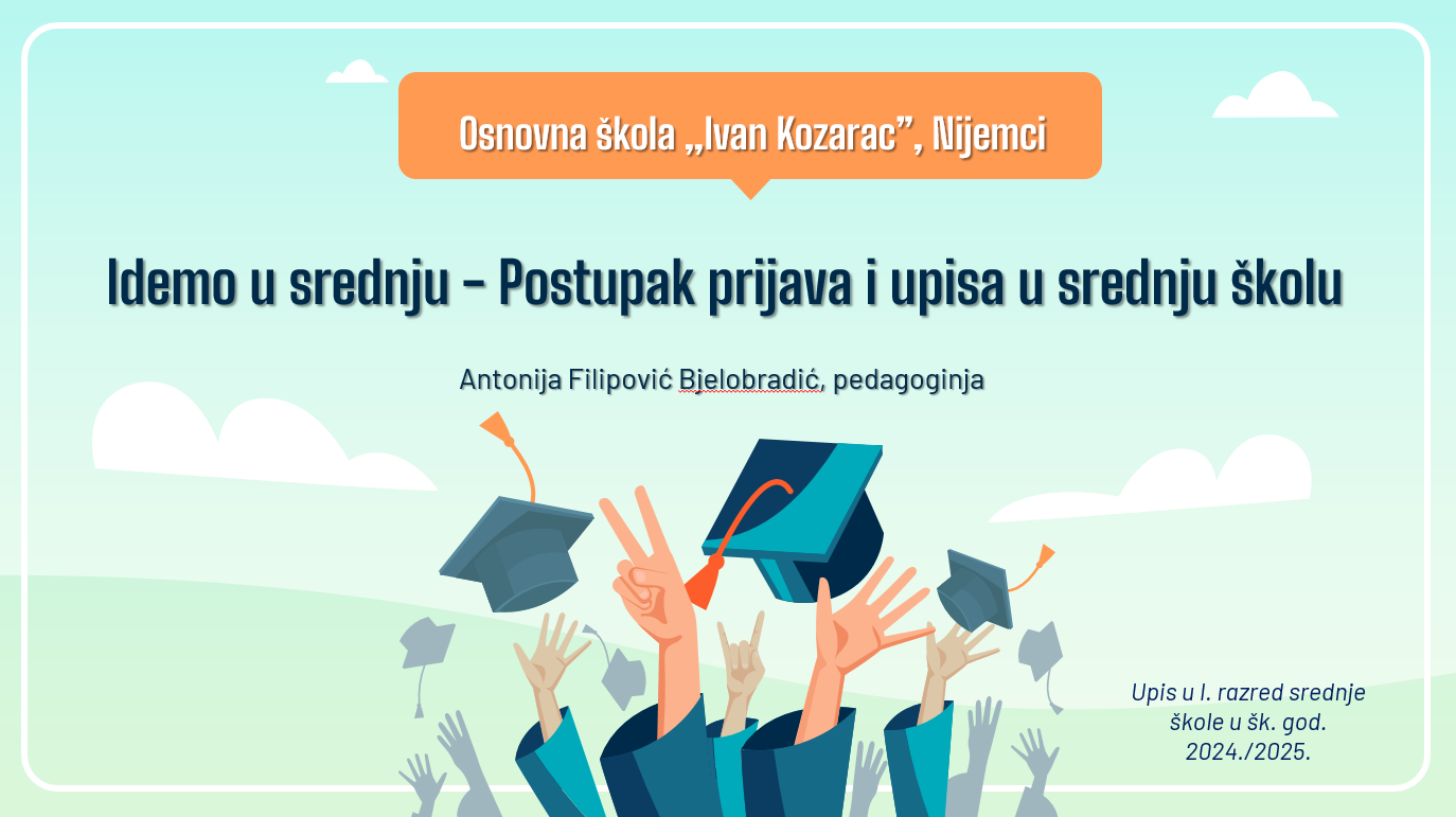 ovdje možete pronaći prezentaciju “Idemo u srednju – Postupak prijava i upisa u srednju školu” izloženu na roditeljskom sastanku i predavanju za učenike koja sadrži sve važne informacije o upisu u srednju školu.