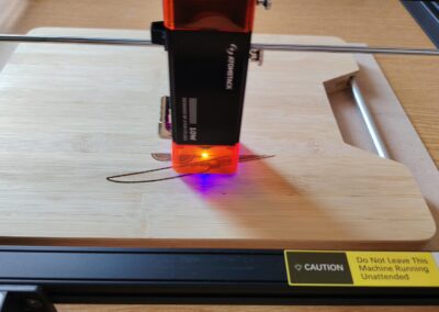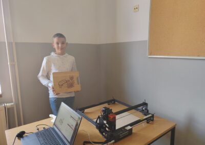 Nakon pripreme nacrta uslijedio je najuzbudljiviji dio, prijenos datoteke na laserski rezač i pokretanje graviranja. Uz pažljivo praćenje rada stroja i uzbuđenje koje se osjećalo u učionici, prvi proizvod je uspješno izrađen! Osmijesi na licima učenika bili su najbolji dokaz koliko je ovaj trenutak bio poseban.