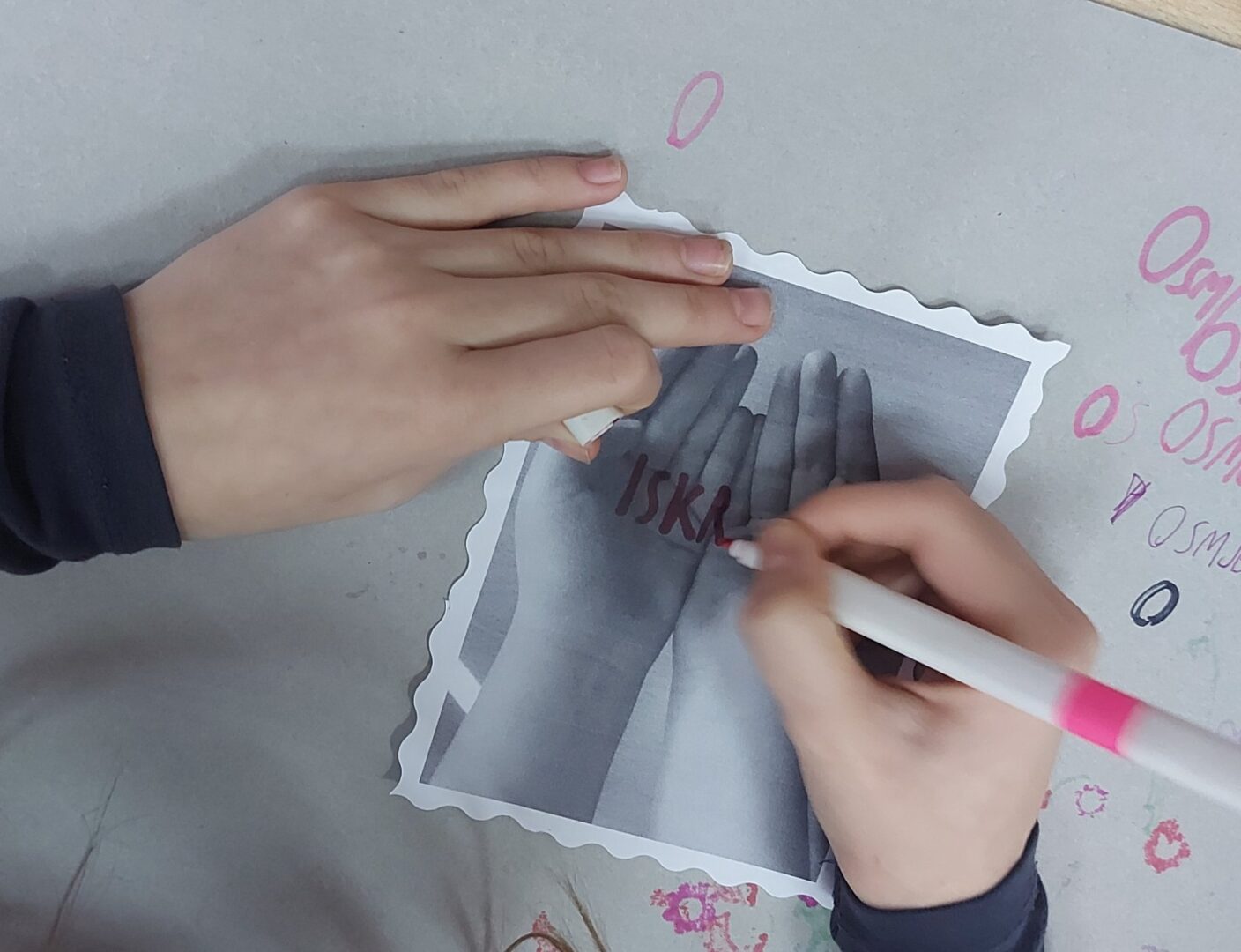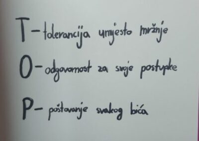 U sklopu literarno-novinarske skupine održana je likovno-literarna radionica u kojoj su sudjelovali učenici 5. a i 6. a razreda. Učenici su fotografirali svoje dlanove i na njima ispisivali vrijednosti koje se žele širiti kroz odgoj i obrazovanje. Poslali su snažnu poruku da ruke ne trebaju služiti nasilju, već dijeljenju dobrote, ljubavi, blagosti, opraštanja, iskrenosti, zahvalnosti, nade, podrške, odgovornosti… Njihovi radovi simbolično poručuju: umjesto nasilja – pružimo ruku prijateljstva.