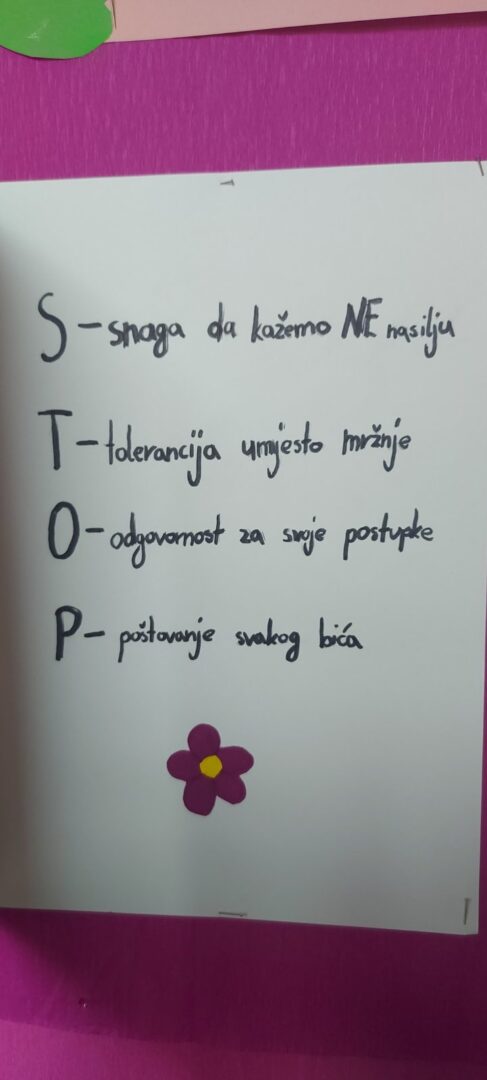 Članovi literarno-novinarske skupine uredili su dva panoa. Prvi pano prikazuje značenje ruku koje dijele vrijednosti pravog prijateljstva i međusobne podrške, dok je drugi osmišljen s motivom prozora i akrostihom čija početna slova nose jasnu i snažnu poruku – STOP NASILJU.