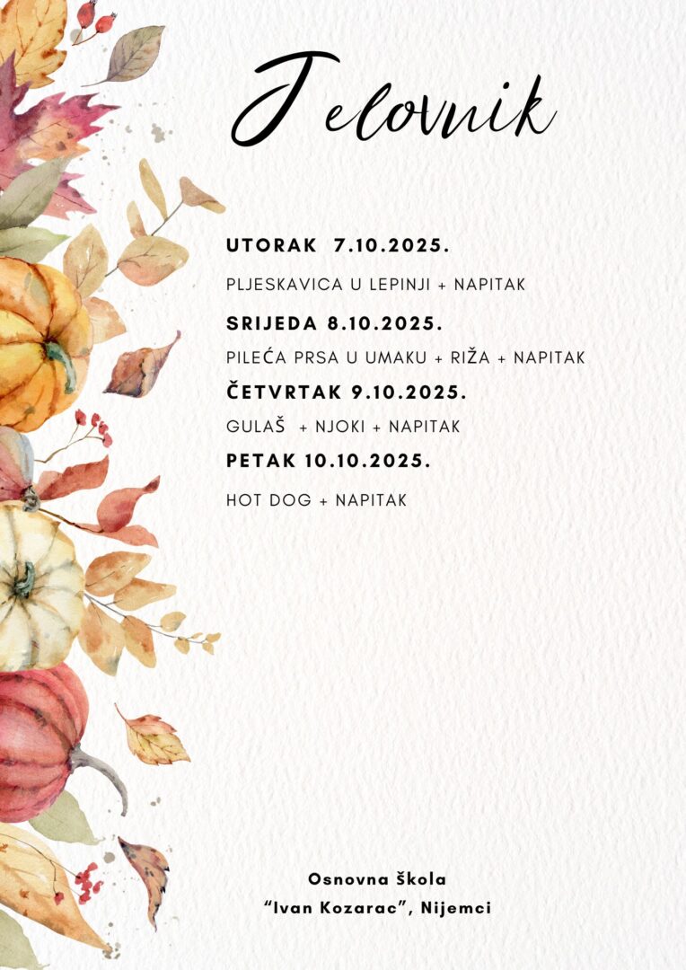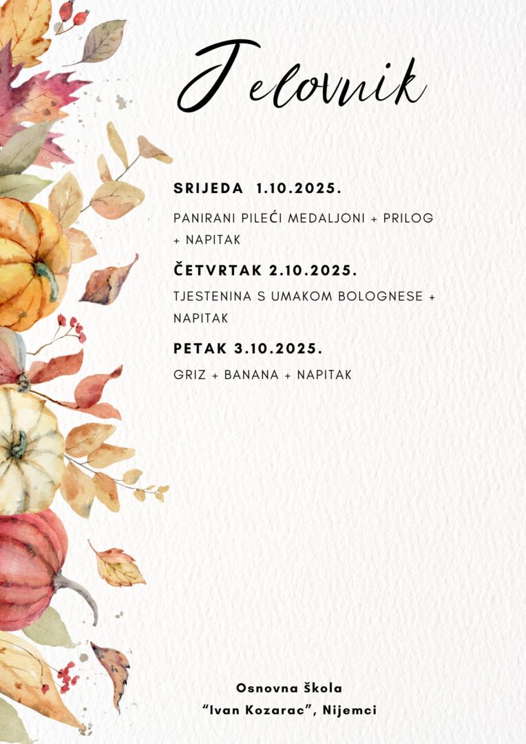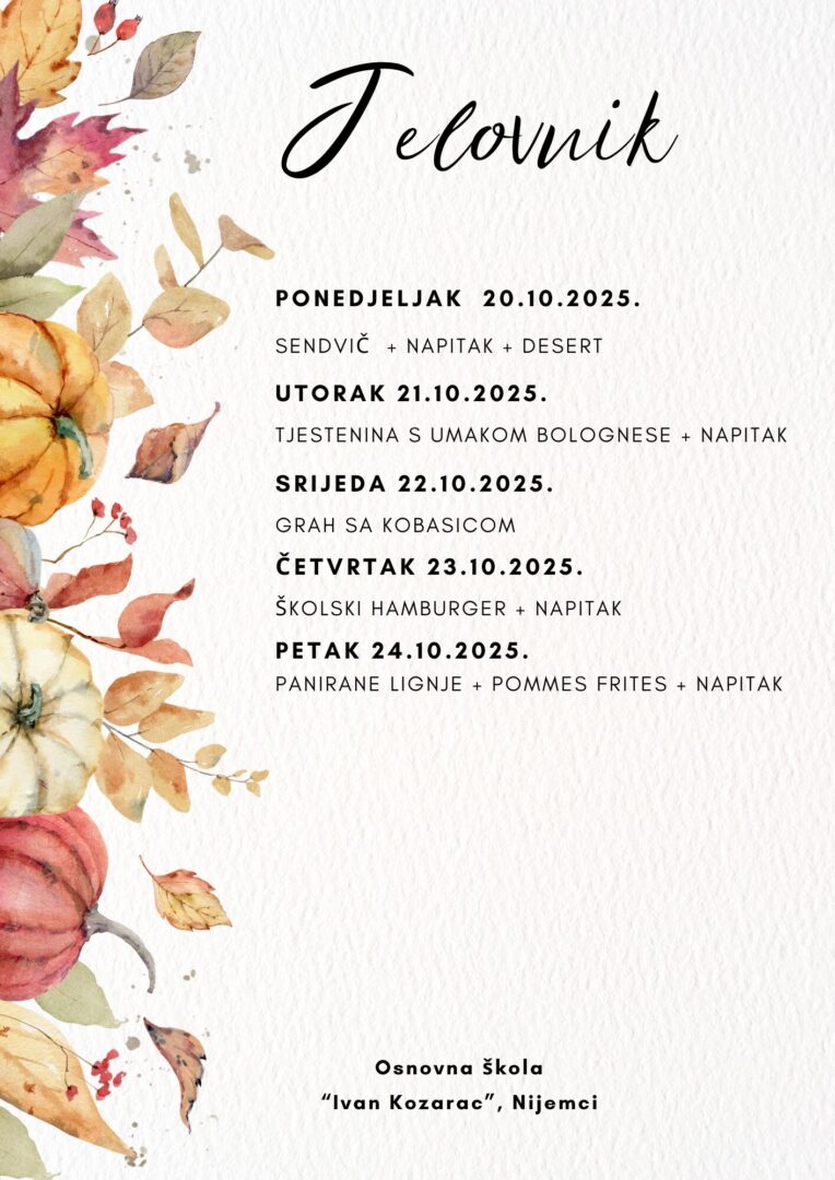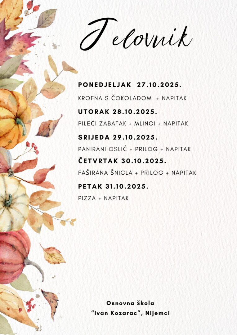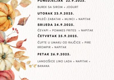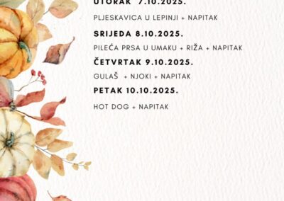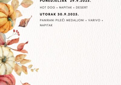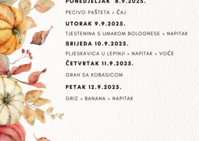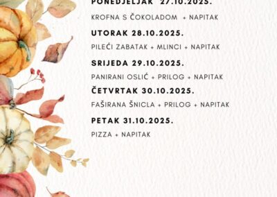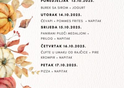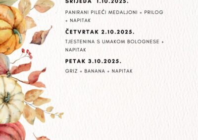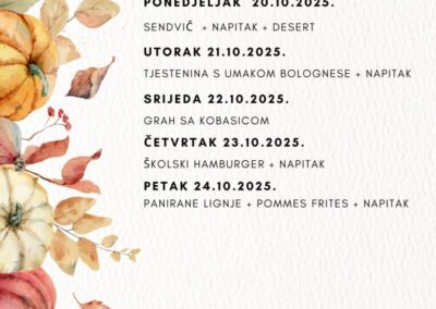 JELOVNIK ZA LISTOPAD Jelovnik od 1. do 3.10.2025. Jelovnik 7. do 10.10.2025. Jelovnik 13. do 17.10.2025. Jelovnik 20. do 24.10.2025. Jelovnik 27. do 31.10.2025. JELOVNIK ZA RUJAN Jelovnik 8. do 12.9.2025. Jelovnik 15. do 19.9.2025. Jelovnik 22. do 26.9.2025. Jelovnik 29. do 30.9.2025.
