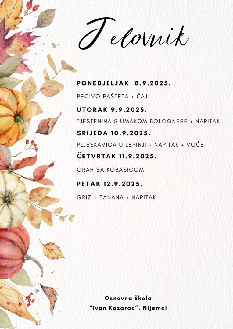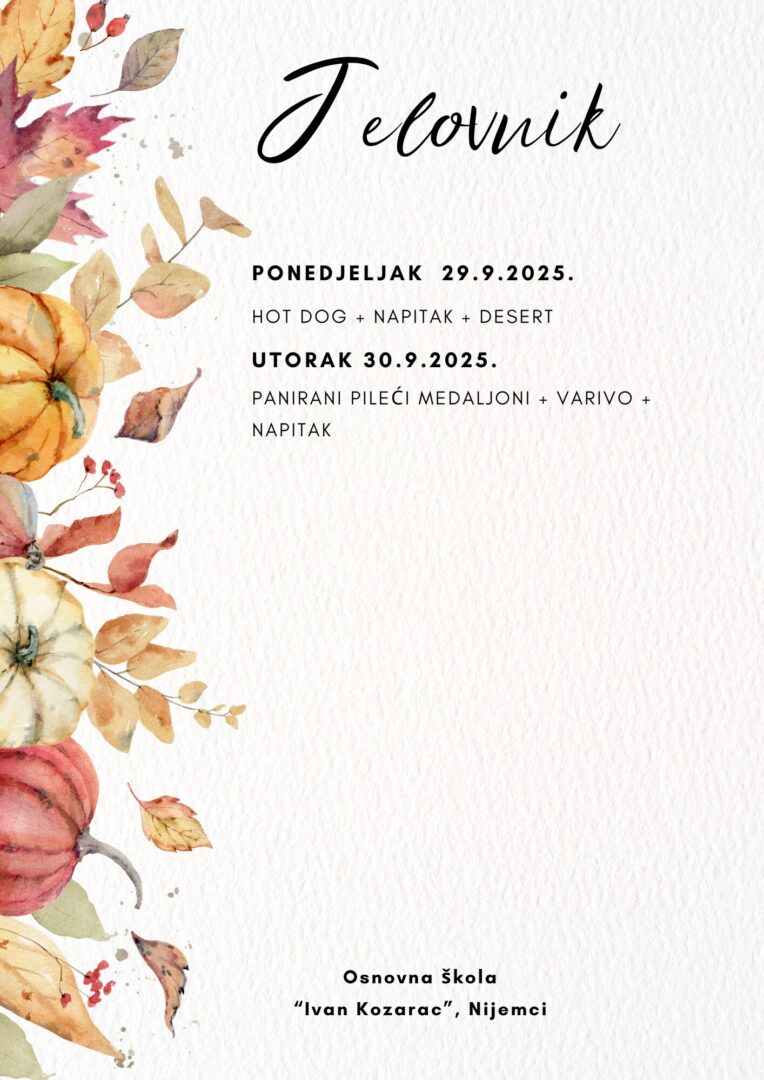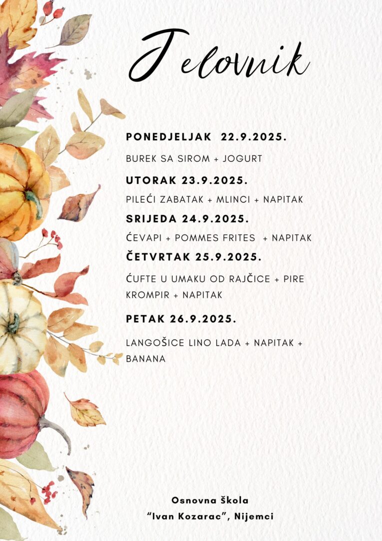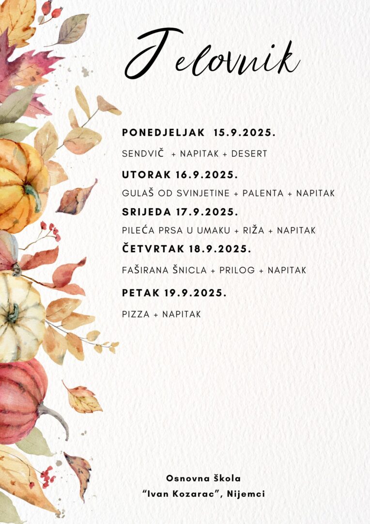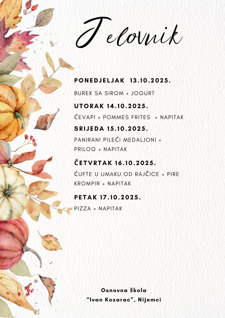 JELOVNIK ZA LISTOPAD Jelovnik od 1. do 3.10.2025. Jelovnik 7. do 10.10.2025. Jelovnik 13. do 17.10.2025. Jelovnik 20. do 24.10.2025. Jelovnik 27. do 31.10.2025. JELOVNIK ZA RUJAN Jelovnik 8. do 12.9.2025. Jelovnik 15. do 19.9.2025. Jelovnik 22. do 26.9.2025. Jelovnik 29. do 30.9.2025.